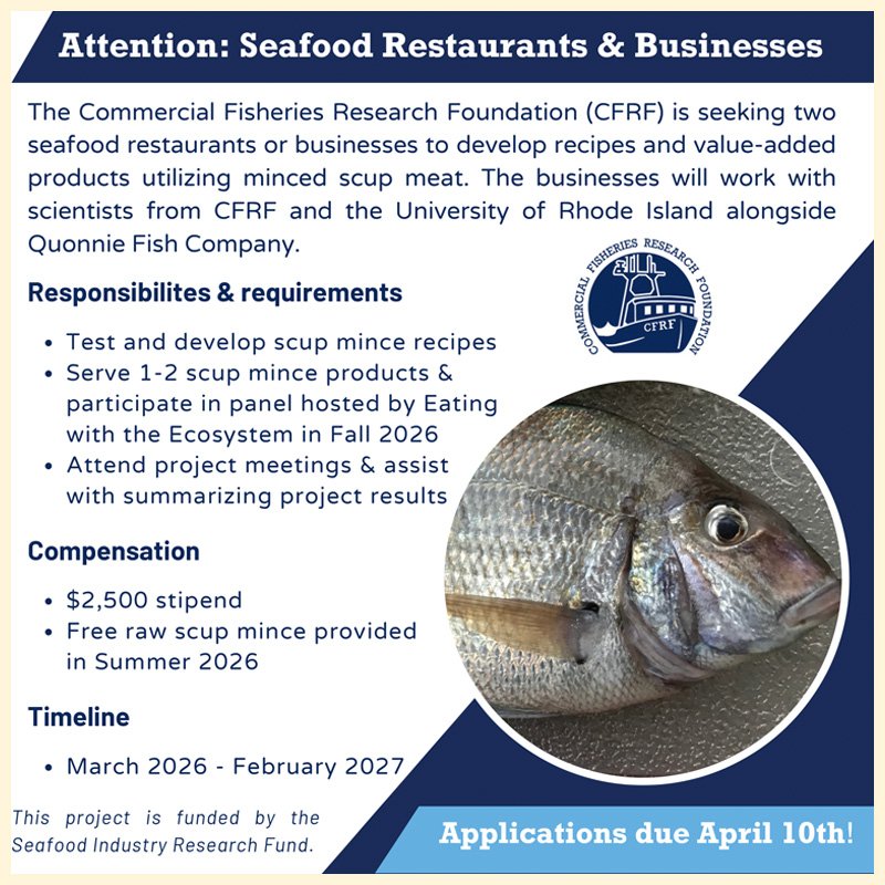 Compensation: The two selected Restaurants/Seafood businesses will receive a stipend of $2,500 to participate in the project. The project has an allocated budget to purchase local scup so that raw scup mince can be provided to the participating businesses for recipe development in the summer of 2026. Timeline: The overall project timeline is March 2026 – February 2027. The project kick-off meeting will occur in mid/late April. Businesses will be provided raw scup mince throughout this summer and will showcase 1-2 products at the EWTE panel in the Fall.